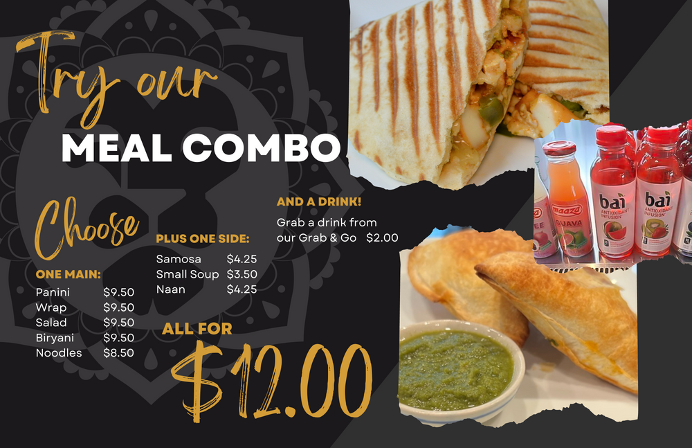 Perfect lunchtime combo meal, choose your entree, side, and drink for only $12. Order online for pick-up and delivery.